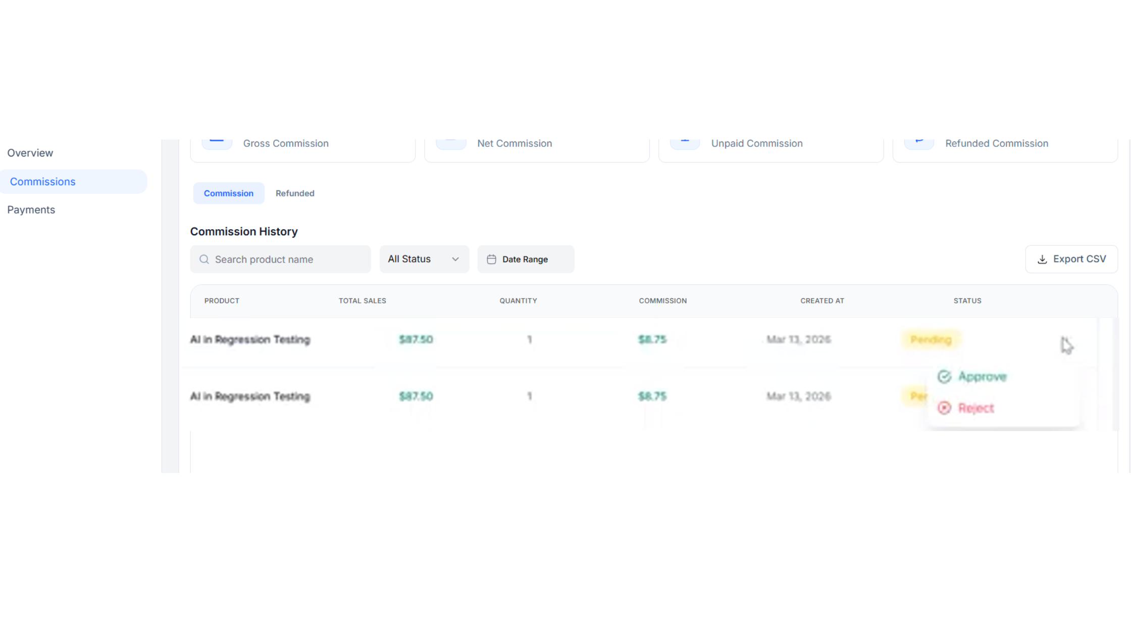 4. Click on the Commissions tab and then click on the 3 dots of the commission to either approve or reject the commission